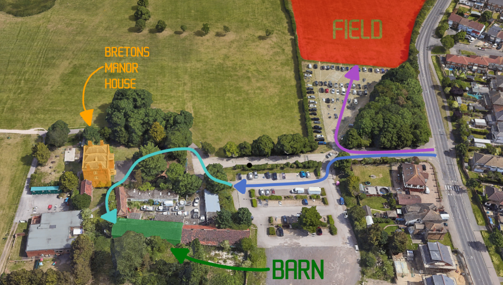 For the indoor season, we have the use of a 16th Century barn, in the grounds of Bretons manor house. (Shown as a yellow block).